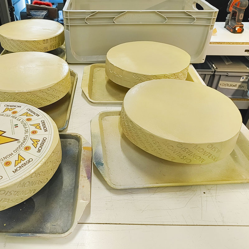 La tecnologia 3D ci consente di ottenere formaggi finti realistici a grandezza naturale, curati in ogni dettaglio. Che si tratti di una forma di Grana Padano, di un Montasio® o di un pecorino locale, riusciamo a riprodurla fedelmente: dalla dimensione esatta fino alla texture della crosta con eventuali marchi o loghi. Anche la colorazione viene eseguita a mano con la massima cura, per un effetto assolutamente naturale.