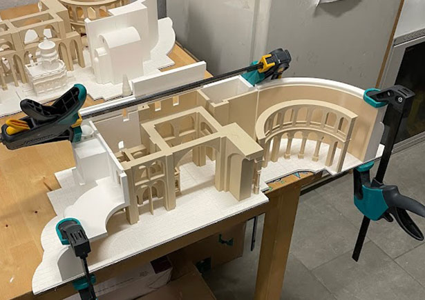Il montaggio finale del plastico è stato un processo dettagliato che ha visto l'assemblaggio di 114 parti incollate, creando una struttura finale di dimensioni imponenti, pari a 82x72 cm. Questo approccio ha garantito non solo la precisione e la solidità dell'allestimento, ma ha anche permesso di soddisfare completamente le specifiche del progetto museale, offrendo un risultato visivamente dinamico e accurato nei dettagli architettonici.