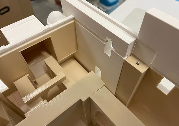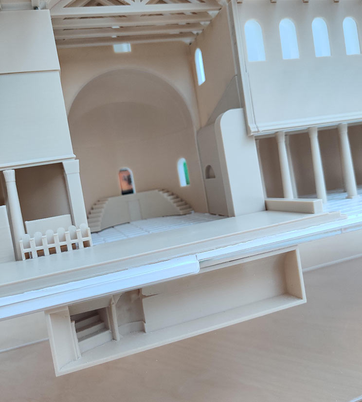 Partendo da un modello 3D esistente ma non stampabile, è stato necessario rielaborare il design per adattarlo ai parametri estetici richiesti dal committente. Dopo la suddivisione dell'edificio in due sezioni lungo la navata principale e la progettazione di incastri e connessioni intricate tra le parti, si è concentrati sulla creazione di un pavimento dettagliato e accuratamente piastrellato.